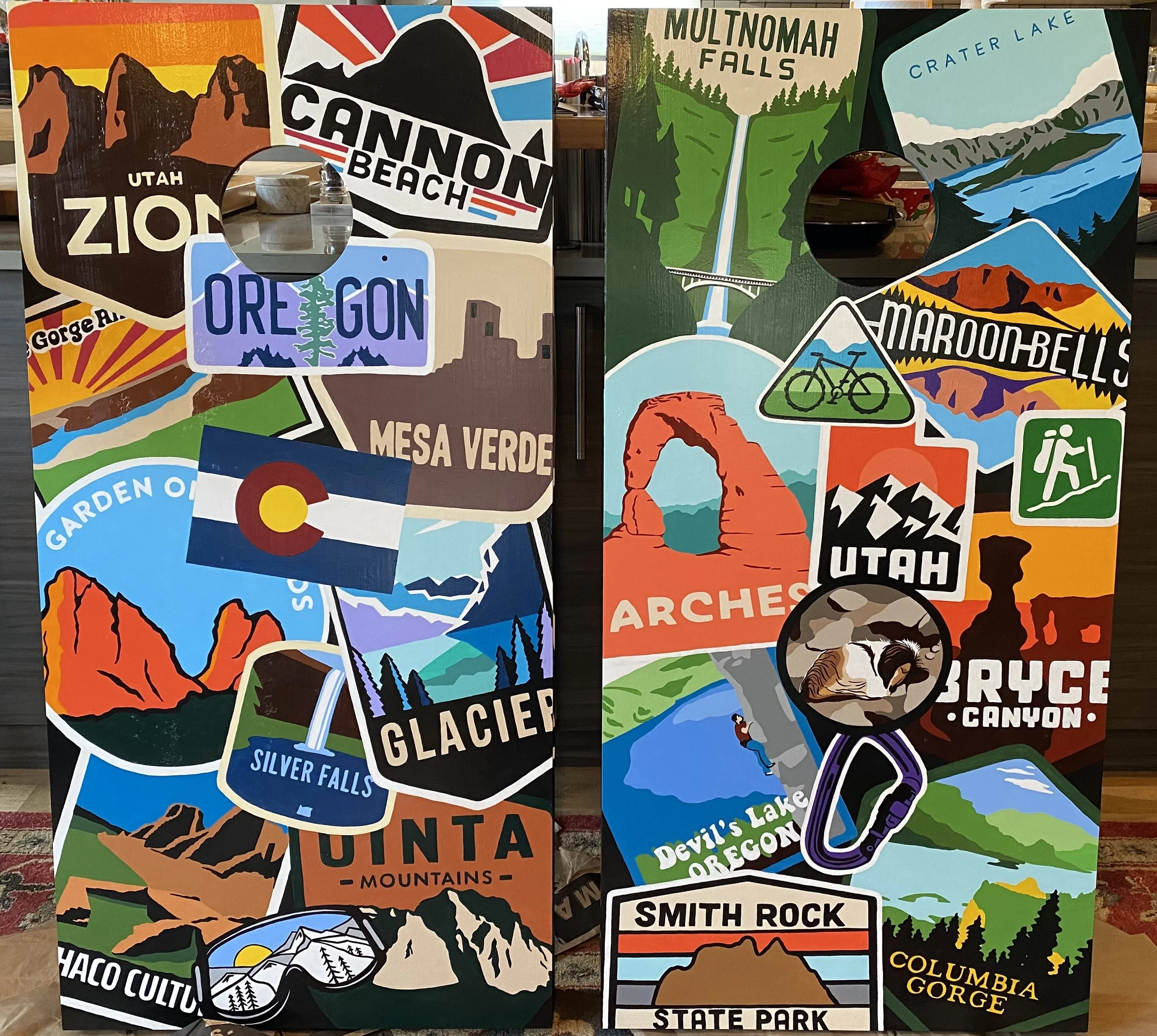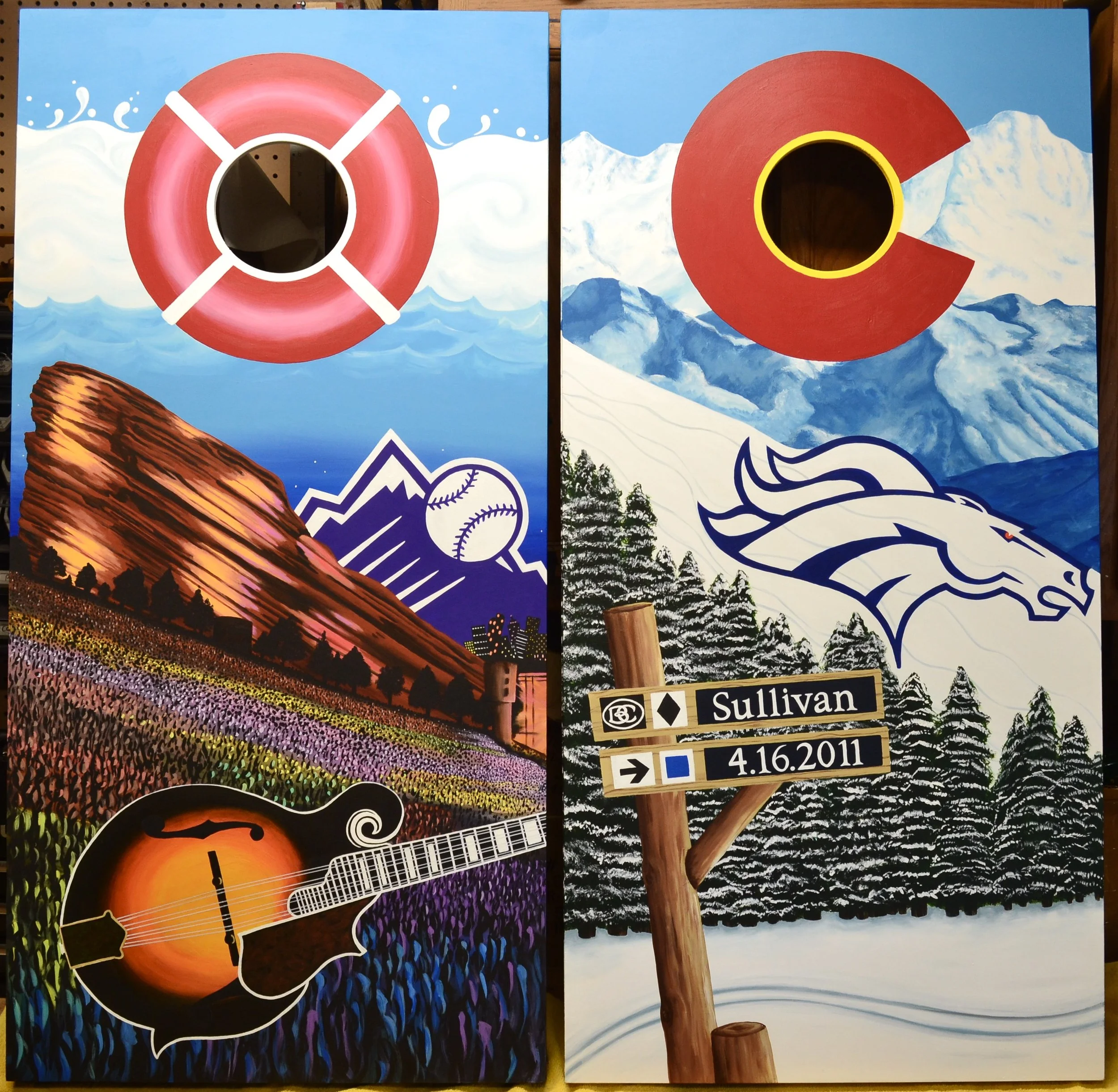 Murals & House Tattoos Mosaics Graphic Design/Logos Signage Canvas Paintings, Illustration, and Small Scale Projects Cornhole Sets: Mountains, Colorado, & Outdoors Cornhole Sets: Custom Mash-ups Cornhole Sets: Sports Cornhole Sets: Business